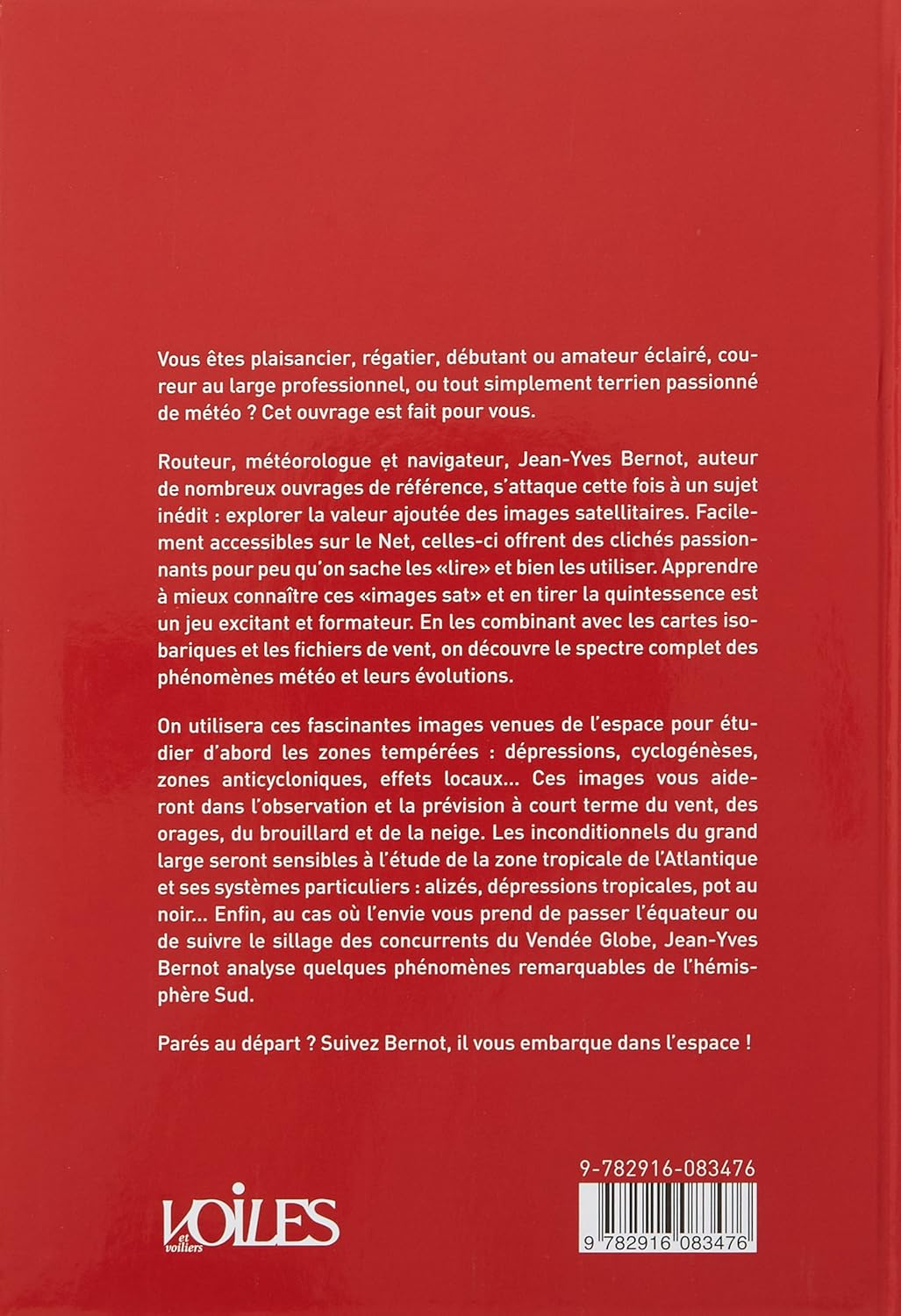 Avec Jean-Yves Bernot vous apprendrez à mieux connaître ces « Images sat », en tirer la quintessence et prévoir votre météo à terre comme en mer. Un jeu excitant et formateur ! En les combinant avec cartes isobariques et fichiers de vent, vous découvrirez le spectre complet des phénomènes météo et leurs évolutions. Vous utiliserez ces fascinantes images venues de l'espace pour étudier d'abord les zones tempérées : dépressions, cyclogénèses, zones anticycloniques, effets locaux… Elles vous aideront dans l'observation et la prévision du vent, des orages, du brouillard et des précipitations. Les inconditionnels du grand large seront sensibles à l'étude de l'Atlantique et ses systèmes : alizés, dépressions tropicales, pot au noir. Enfin, si l'envie vous prend de passer l'équateur ou de suivre le sillage des concurrents du Vendée Globe, Jean-Yves Bernot analyse quelques phénomènes remarquables de l'hémisphère Sud. Parés au départ ? Suivez "Le Sorcier", il vous embarque dans l'espace! En complément du livre Jean-Yves Bernot a conçu pour vous des exemples, des études de cas, des compléments à retrouver absolument sur le site de Voiles et Voiliers Rendez-vous sur le mini site "Les routages de Jean-Yves Bernot" : www.voilesetvoiliers.com/mini-site-bernot JY Bernot propose un décryptage pédagogique des images venues de l'espace. Grâce à un accord entre l'Université de Dundee (Ecosse) et Voiles et Voiliers, cet ouvrage analyse des dizaines d'images de notre planète vue de l'espace, de jour comme de nuit. En les combinant avec des cartes et des champs de vent, Bernot fait découvrir et explique le spectre complet des phénomènes météo et leurs évolutions. De manière très didactique, on y comprend aussi bien les zones tempérées que l'Océan Atlantique ou encore les océans du Grand Sud bien connues des navigateurs du Vendée Globe. Un livre fascinant, ludique... et utile pour prévoir sa météo ! 1 - Jean-Yves Bernot, navigateur et routeur météo des plus grands skippers. 2- Explication de la signification des images satellites, plus utilisation. 3- Comment analyser, utiliser et comprendre les phénomènes météo. 4- Livre destiné aux marin, terriens, d'ailleurs...